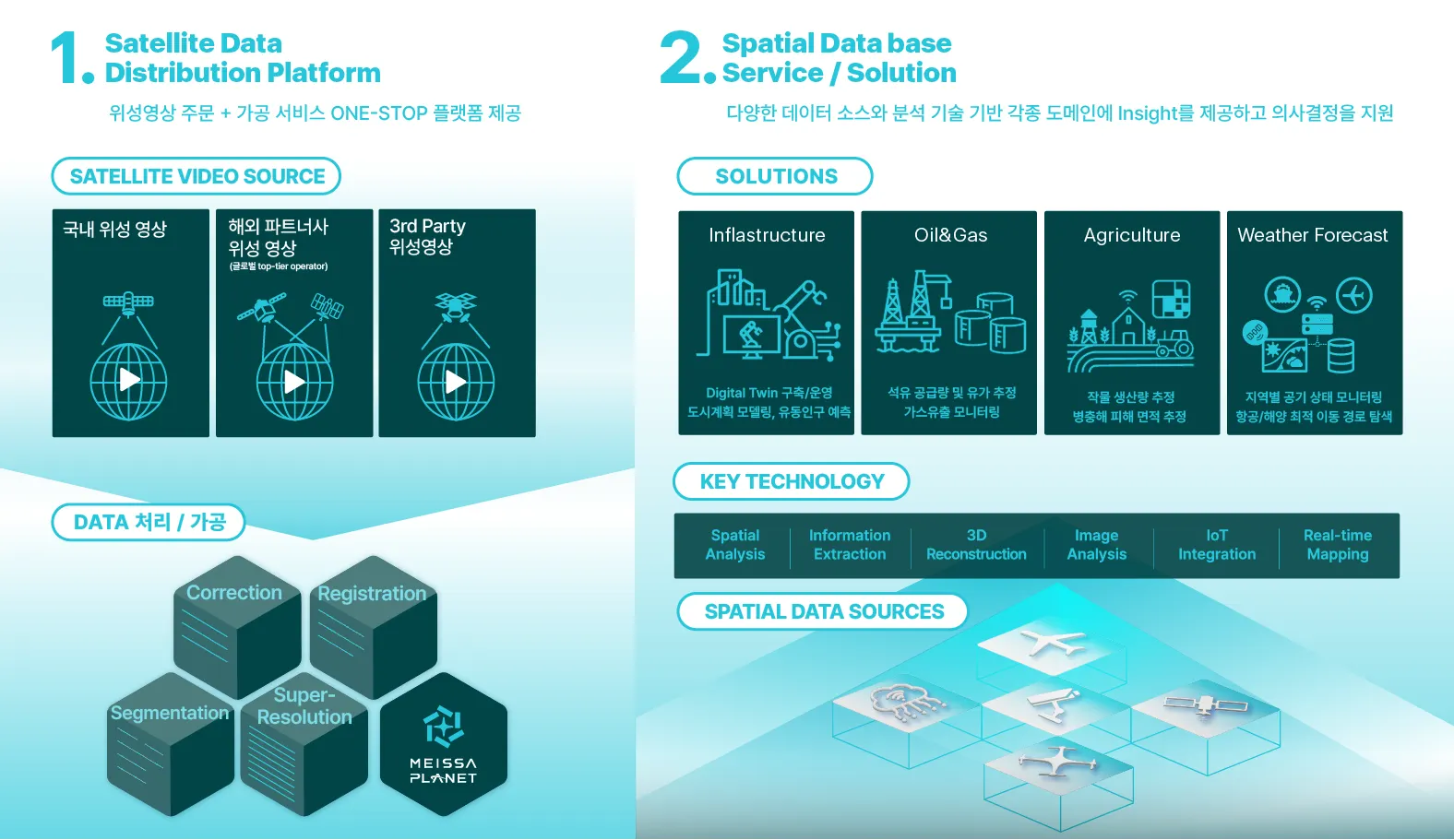 Meissa 는 드론 데이터 플랫폼을 기반으로 다양한 스마트건설 기술을 아우르는 통합 스마트건설 플랫폼으로 발전하고, 나아가 KAI(한국항공우주산업)과의 합작 법인 설립을 통해 우주 위성 영상 서비스 시장으로 사업 영역을 넓히며 드론 이미지부터 인공위성 영상까지 전방위적 공간 정보를 다루는 공간 정보(Spatial Data) 전문 기업으로의 성장하고 있어요